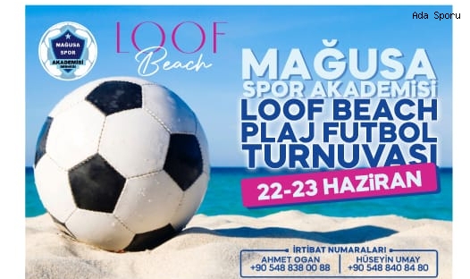Mağusa Spor Akdemisi tarafından organize edilen Loof Beach ana sponsorluğunda gerçekleştirilecek olan plaj futbol turnuvası yapılıyor. Glapsides Loof Beach plajında düzenlenecek olan plaj futbol turnuvası 22-23 Haziran tarihleri arasında yapılıyor. Mağusa Spor Akademisi tarafından organize edilen Loof Beach ana sponsoruluğunda gerçekleştirilecek olan plaj futbol turnuvasına KTFF bağlı lisanslı (Süper, 1. Lig, BTM 1. ve 2. Lig, Genç takımlar dahil ve KTFF Yerli Yabancı Lisansa sahip oyuncular oynayabilirler.)
